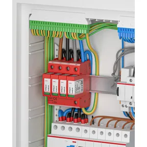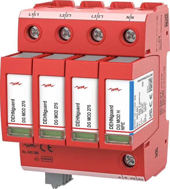 Modular surge arrester with a high total discharge capacity in the N-PE path for TT and TN-S systems (3+1 configuration). Meets the stricter safety requirements as outlined in DIN VDE 0100-534 for use at the feeding point of the electrical installation; with floating remote signalling contact.