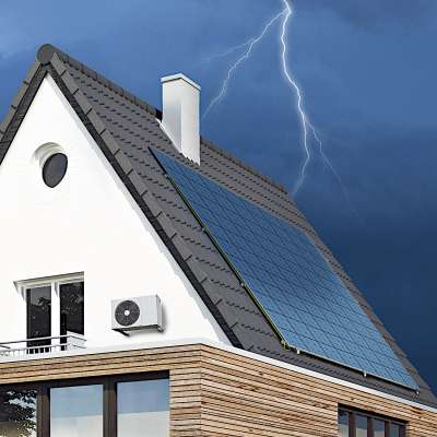 Die Außeneinheit der Wärmepumpe wird häufig im Garten platziert. Dadurch ist die Leitungslänge zwischen Gerät und Überspannungsableiter meist größer als 10 m. Hier empfiehlt sich ein zusätzlicher Überspannungsableiter Typ 2 so nahe wie möglich am Gerät oder direkt nach dem Gebäudeeintritt der Leitung (DIN VDE 0100-534).
