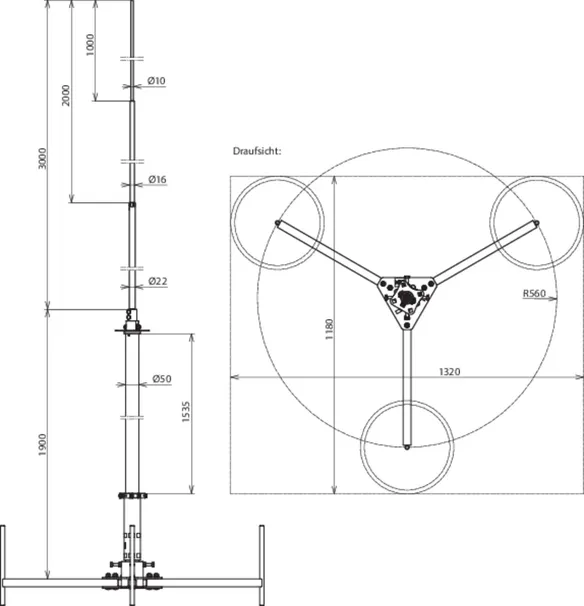 Fangmast komplett mit Vierfach-Anschlussplatte für die HVI light Leitung und Befestigungsset zur Montage der Leitung am Fangmast.