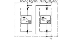 Zweipoliger, modularer, koordinierter Blitzstrom-Ableiter für Gleichstromanwendungen bis 60 V (1+1-Schaltung); in der Ausführung FM mit potentialfreiem Fernmeldekontakt.
