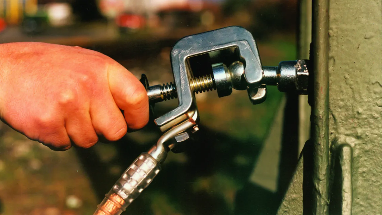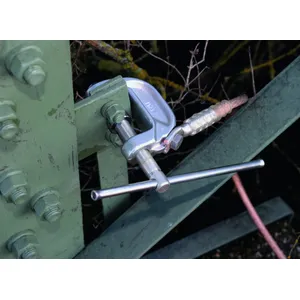 Erdungsfräsklemme an lackiertem Stahlmast.