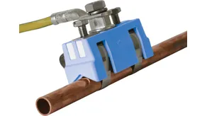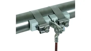 Anschlüsse für den Potentialausgleich und den Blitzschutz-Potentialausgleich in Ex-Bereichen wurden bis dato häufig geschweißt oder mit Gewindebuchsen ausgeführt. Der Einsatz von Schellen wird nur genehmigt, wenn die Zündsicherheit bei Blitzströmen nachgewiesen wurde. Einen Nachweis der Zündfunkenfreiheit bei Blitzstrombeanspruchung hat DEHN für die Bandrohrschellen erbracht. Durch die Realisierung der Prüfung nach DIN EN 62561-1 (VDE 0185-561-1): Anforderungen für Verbindungsbauteile (Klemmen und Verbinder) in einer explosionsfähigen Atmosphäre wurde die Zündfunkenfreiheit des Prüflings bei einer Blitzstrombeanspruchung bis 50 kA (10/350 µs) nachgewiesen. Der Aufbau dieser neuartigen, patentierten Bandrohrschelle für den Ex-Bereich berücksichtigt zum einen eine sichere elektrische Kontaktierung durch zwei Kontaktbügel, zum anderen die mechanische Fixierung über je einen elektrisch isolierten Schellenkörper. Zur fachgerechten Vorspannung des Spannbandes wird einmalig das separat erhältliche Montageset (Art.-Nr. 540902) benötigt.