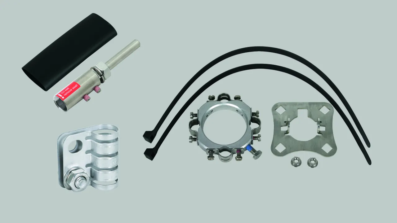 Befestigungsset zur Montage der HVI light Leitung am Stützrohr Ø50 mm (z. B. HVI long Stützrohr), bestehend aus Anschlussplatte (vierfach, inkl. zwei Sperrzahnmuttern) und Befestigungsring mit vier geschlitzten Leitungshaltern (Ø17 mm) für den Anpassungsbereich (inkl. zwei Kabelbindern).