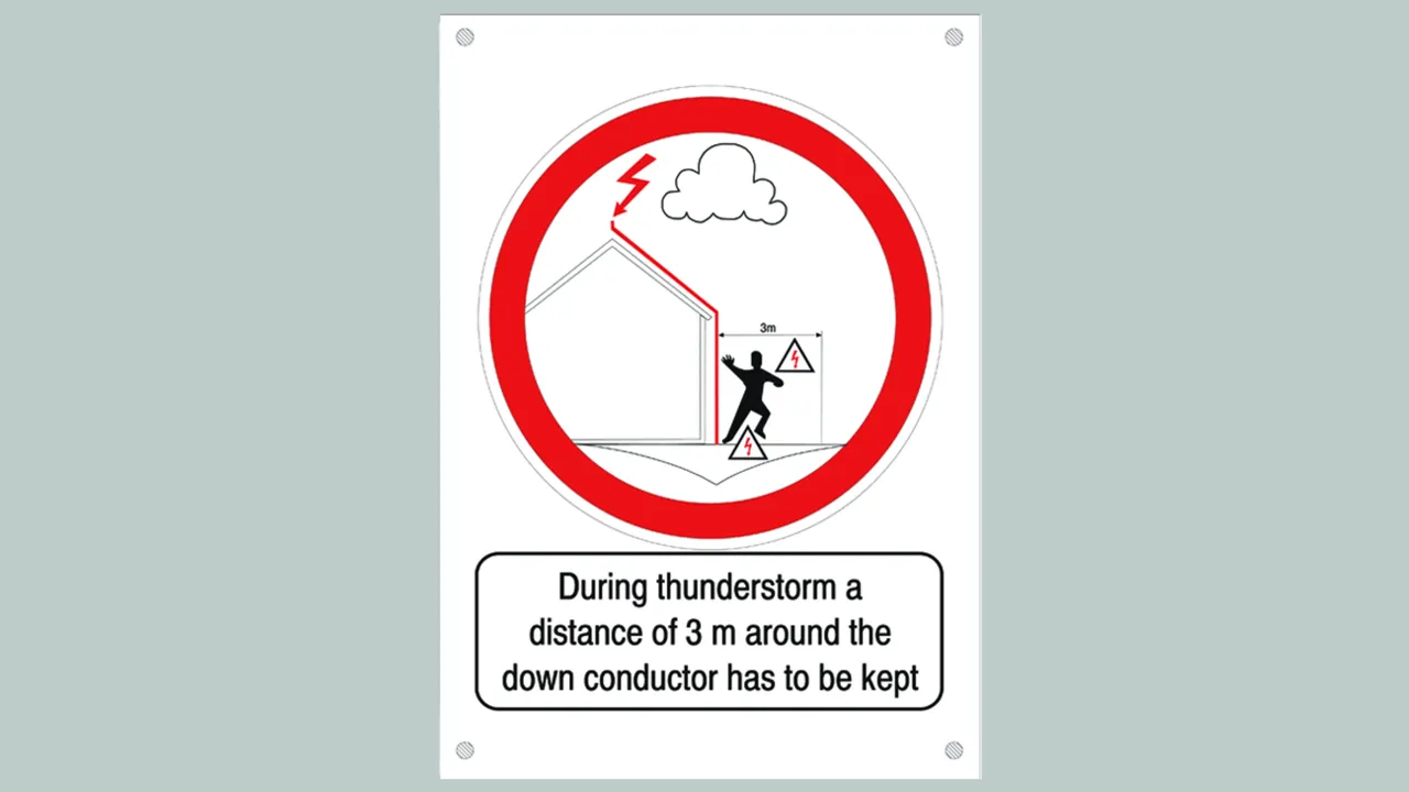 Information sign: Touch and step voltage Information sign about touch and step voltages due to risk of touch and step voltages for living beings as required in DIN EN 62305-3 (VDE 0185-305-3) Bilingual version (front German / back English).