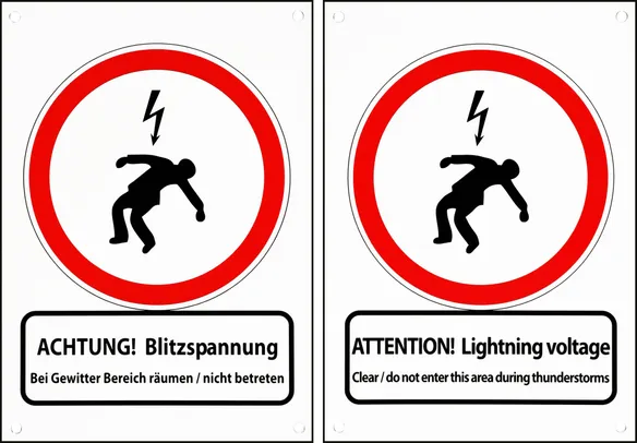"ACHTUNG! Blitzspannung Bei Gewitter Bereich räumen / nicht betreten"
