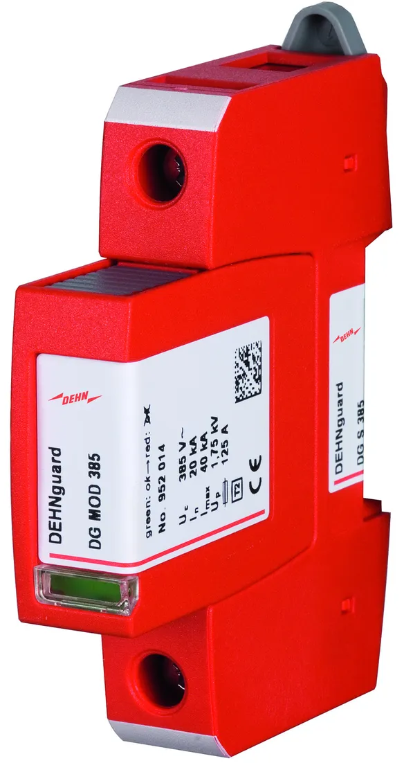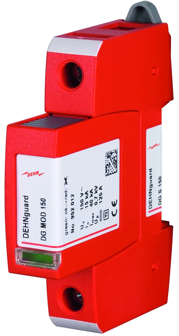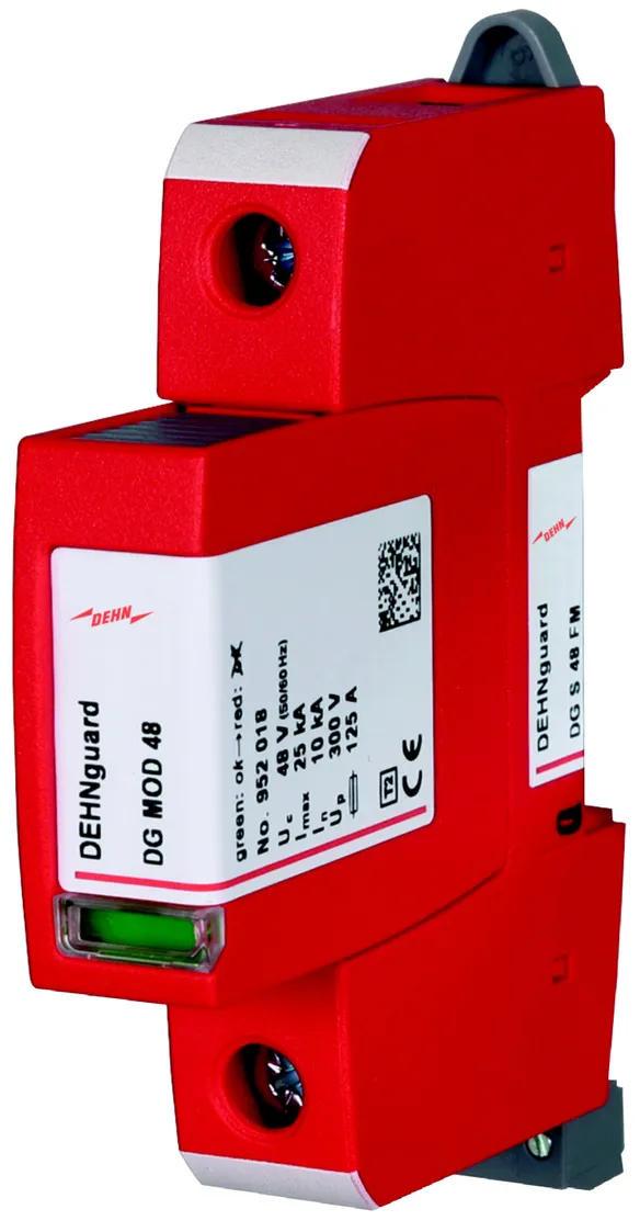 Pluggable single-pole surge arrester consisting of a base part and a plug-in protection module.