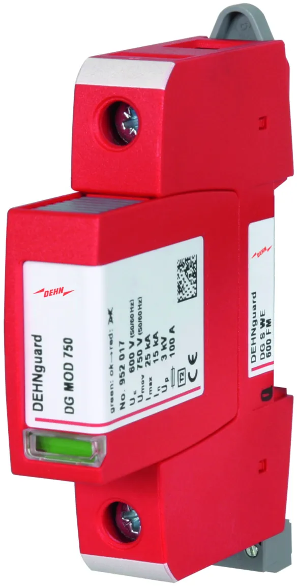 Pluggable single-pole surge arrester with a rated varistor voltage Umov = 750 V a.c., consisting of base part and a plug-in protection module; FM version with floating remote signalling contact.