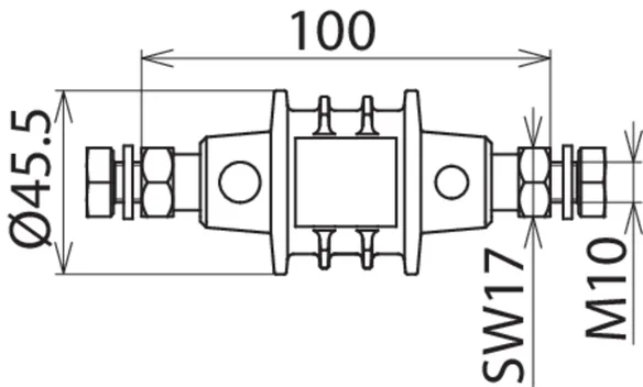 Isolating spark gap for use in hazardous areas with plastic sheath and M10 threaded screws.