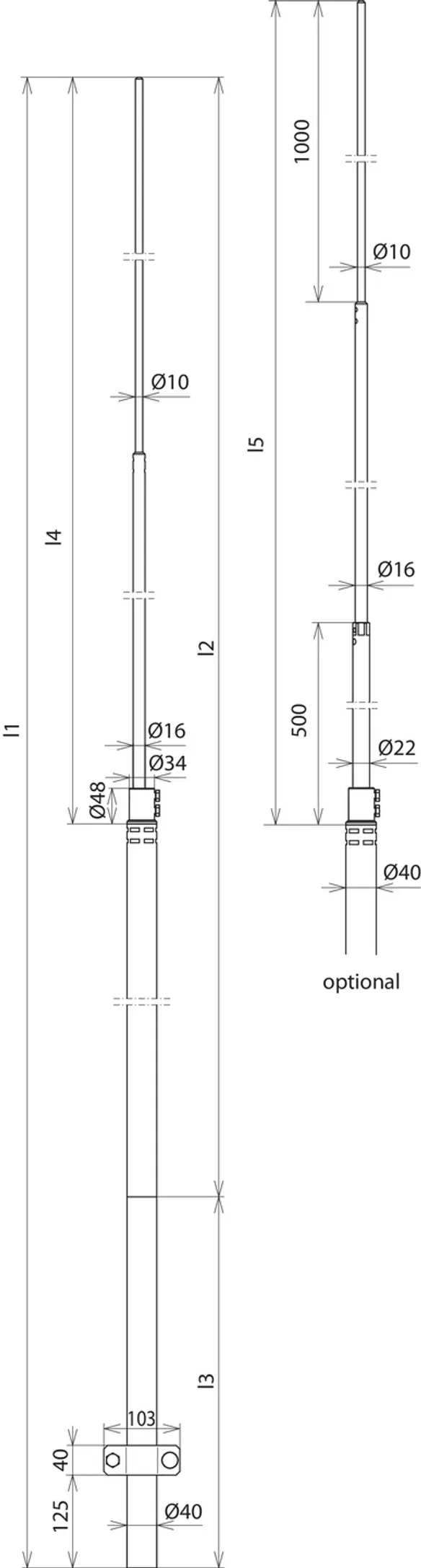Air-termination rods D40 for max. free lengths with a height of up to 4.0 m when fixed on, e.g., walls or other constructions.