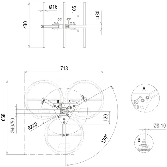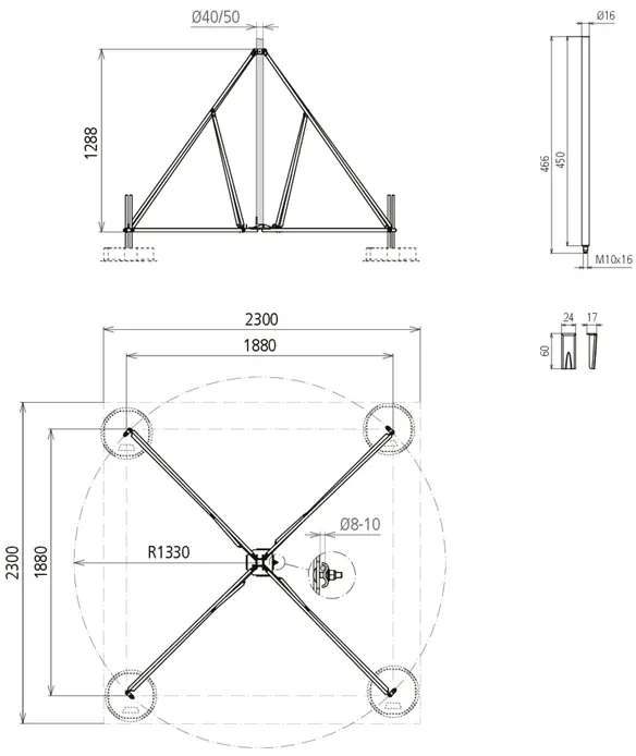 For erection with concrete bases (weight 17 kg). Adjustable to the roof slope up to max. 10° using a variable fixing on the base holder. The D40 air-termination rods / supporting tubes must be ordered separately.