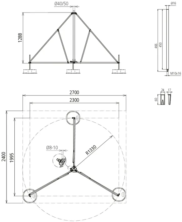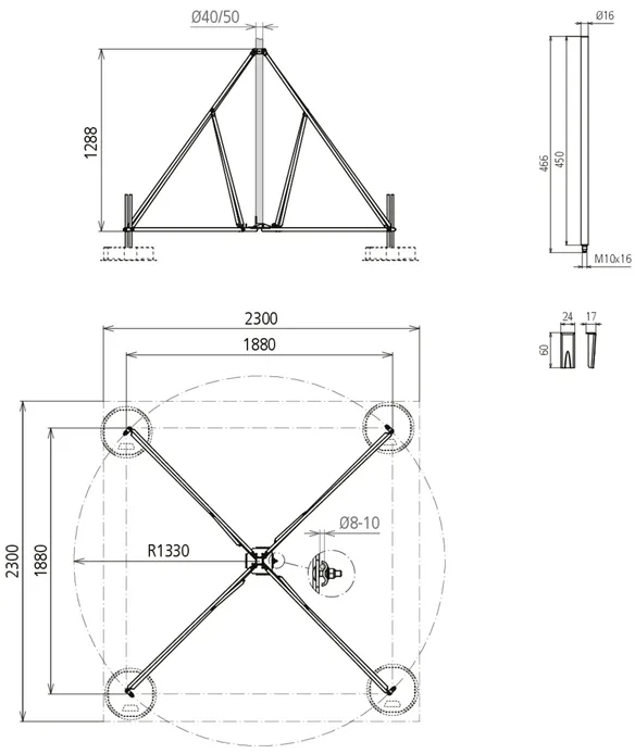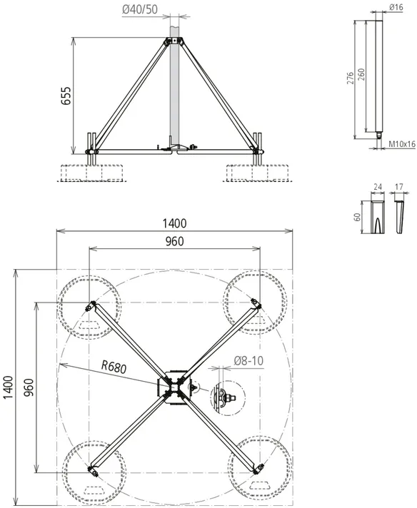 For air-termination rods D40, D50 and D60, DEHNiso Combi supporting tubes with air-termination rod / tip or HVI Conductor installed in / on the supporting tube.