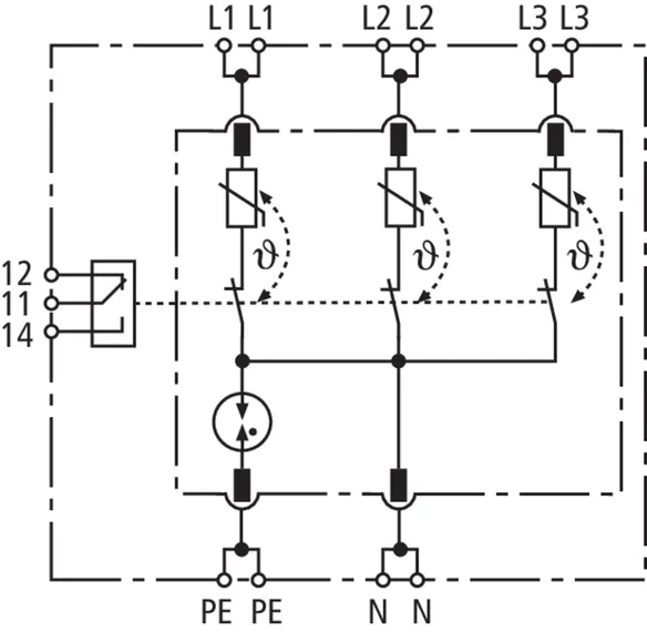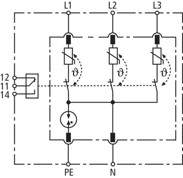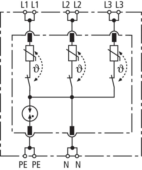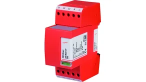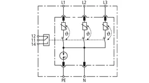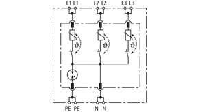 Four-pole surge arrester consisting of a base part and a plug-in protection module; with floating remote signalling contact. Can be used for systems with a fusing up to 32 A.
