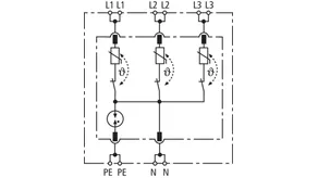 Four-pole surge arrester consisting of a base part and a plug-in protection module; with floating remote signalling contact. Can be used for systems with a fusing up to 32 A.