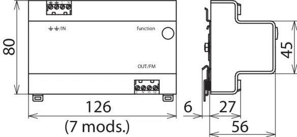 • Visual operating state indication (green) and floating remote signalling contact (break contact) for fault indication