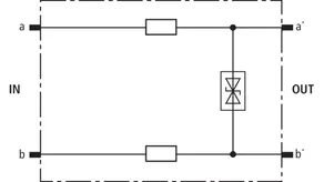 Protective plug (one pair), energy-coordinated with DRL plug-in SPD block, for use as single-stage protective device for terminal equipment for high-frequency transmissions such as G.703 or ISDN U2m, S2m and S0. To be mounted into EF 10 DRL. Installation recommended only in combination with DRL plug-in SPD block.