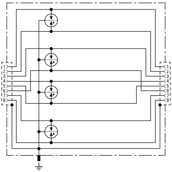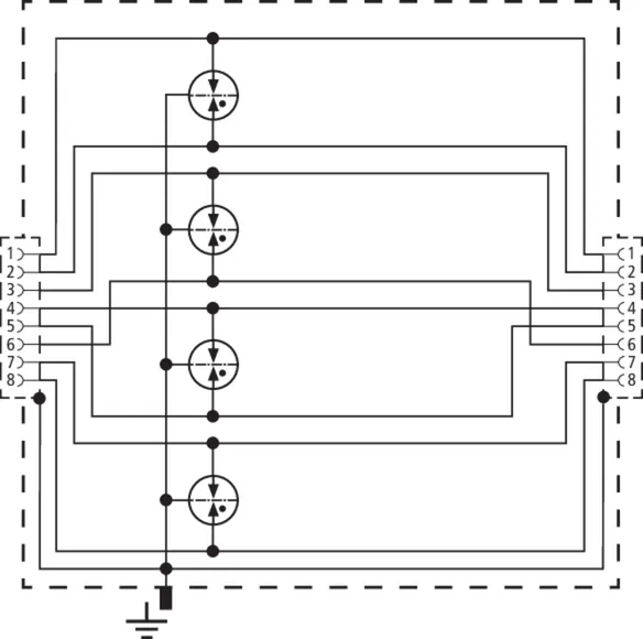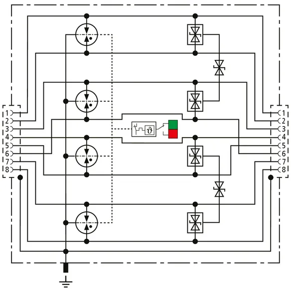 Universal, space-saving combined arrester of 19 mm in width and RJ45 connection system with status indication for simple maintenance. Protection of applications in structured cabling according to class EA to 500 MHz; e.g. industrial Ethernet, data distributors, digital camera systems, Power over Ethernet (IEEE 802.3 compliant to 4PPoE) and Ethernet-based interfaces in general. Protection of all pairs through powerful gas discharge tubes and protective diodes between signal cores and pairs. Fully shielded adapter design with RJ45 sockets for DIN rail mounting. With additional screw connection on the enclosure for an optional earth connection.