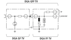 DGA ... TV arresters with F connection for remote supply protect 75-ohm satellite and broadband cable systems and fulfil the high shielding requirements of class A according to EN 50083-2. They allow space-saving installation in all common TV and satellite applications and are available as lightning current arresters, surge arresters and combined lightning current and surge arresters with integrated measuring output for checking the system.