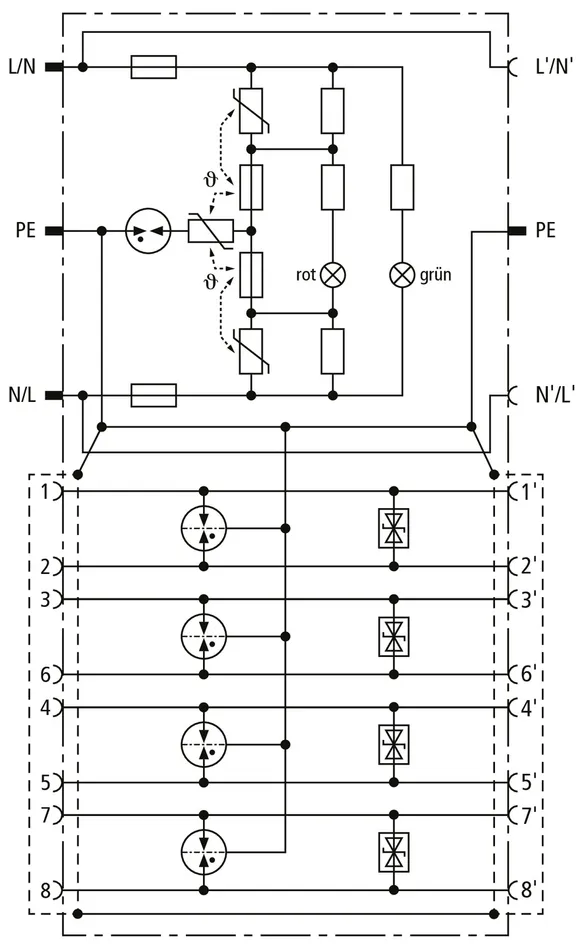 Combined surge protection for the power and data side of a digital network termination (NT) (IP telephony), especially telecommunication interfaces up to VVDSL and G.fast (up 1 Gbit/s). With visual operating state and fault indication and an integrated child lock on the power side.