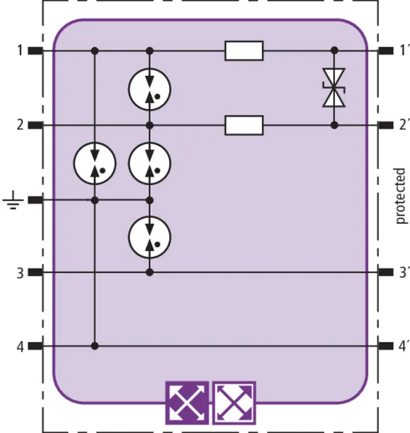 Space-saving surge arrester module with RFID LifeCheck for protecting two pairs in intrinsically safe measuring circuits and bus systems, meets FISCO requirements. ATEX. Insulation strength > 500 V line-earth.