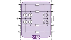 Space-saving surge arrester module with RFID LifeCheck for protecting up to four unearthed single lines sharing a common reference potential in intrinsically safe measuring circuits, meets FISCO requirements. ATEX. Insulation strength > 500 V line-earth.