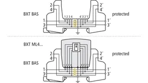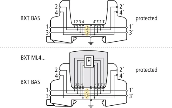 BLITZDUCTOR XT base part for use as an extremely space-saving and universal four-pole feed-through terminal for intrinsically safe circuits for the insertion of the protection module, no signal disconnection if the protection module is removed. The snap-in mechanism at the supporting foot of the base part allows the device to be safely earthed via the DIN rail. Since no components of the protective circuit are situated in the base part, only the protection modules need to be serviced.
