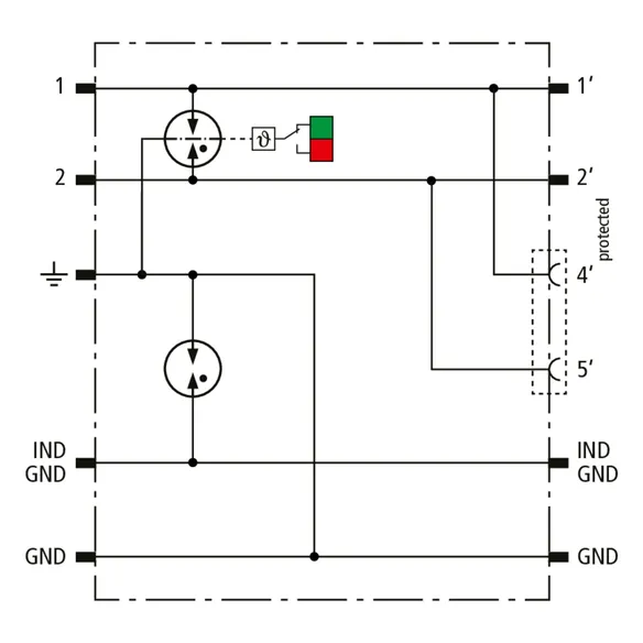 Space-saving, compact surge arrester in a surface-mounted plastic enclosure with push-in connection technology and status indication for protecting one pair of unearthed balanced interfaces, particularly telecommunication interfaces up to VVDSL and G.fast (up to 1 Gbit/s). Direct / indirect shield earthing possible. Connection of a pair or a patch cable with RJ45 plug at the output.