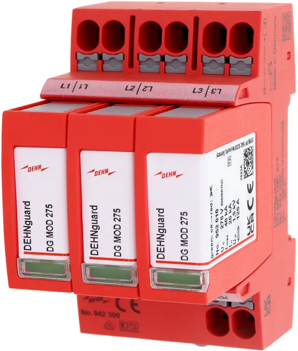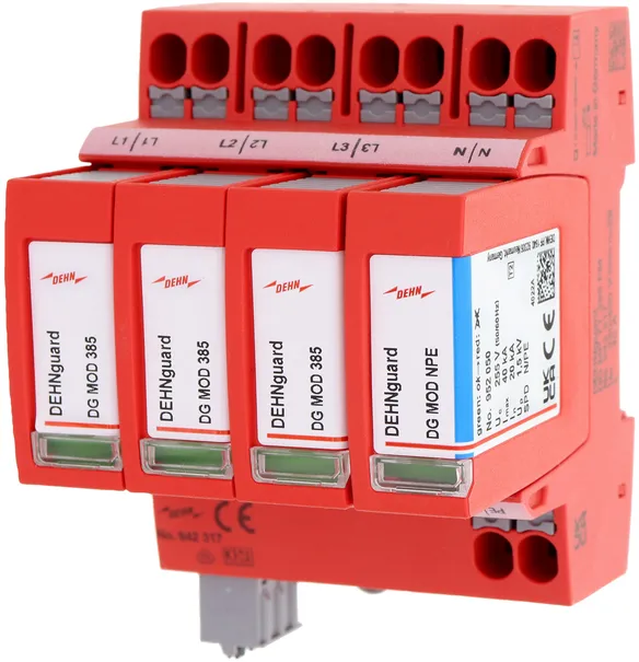 Modular surge arrester with a high total discharge capacity in the N-PE path for TT and TN-S systems (3+1 configuration). Meets the stricter safety requirements as outlined in DIN VDE 0100-534 for use at the feeding point of the electrical installation; with floating remote signalling contact.