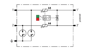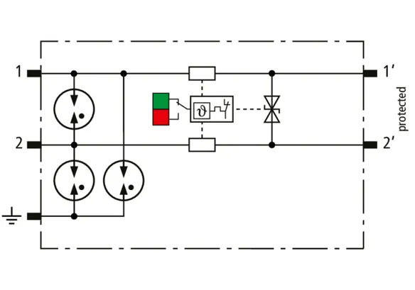 Combined arrester protection module with a width of 6 mm for BLITZDUCTORconnect with status indication for protecting one pair in 24 V DC systems. Also suitable for use with an earthed negative pole. Integrated PTC resistors allow for secure resetting of the arrester after interference in the system circuit with short-circuit currents of up to 40 A.