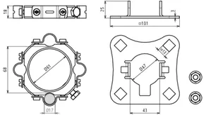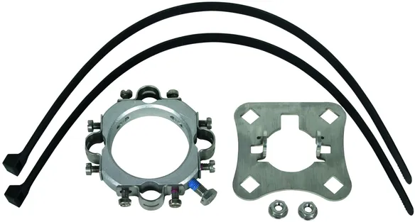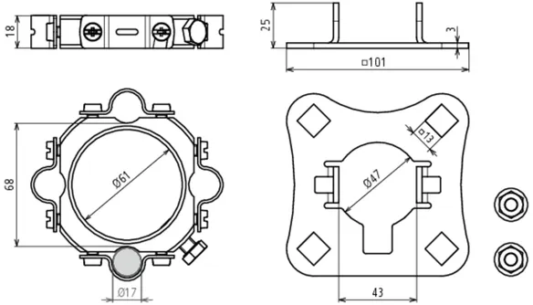 Fixing kit for mounting the HVI light Conductor on the supporting tube Ø50 mm (e.g. HVI long supporting tube), consisting of a connection plate (for four conductors, incl. two self-locking nuts) and a fixing ring with four slotted conductor holders (Ø17 mm) for the adjustment range (incl. two cable ties).